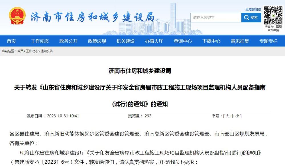 · 2023-11-01 11:15:28 关于转发《山东省住房和城乡建设厅关于印发全省房屋市政工程施工现场项目监理机构人员配备指南(试行)的通知》的通知