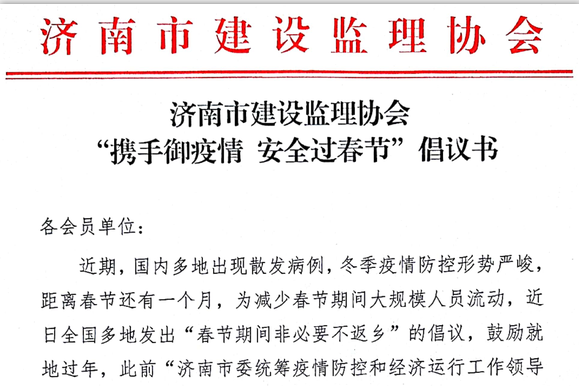 · 2021-01-12 11:03:22 济南市建设监理协会 携手御疫情 安全过春节倡议书